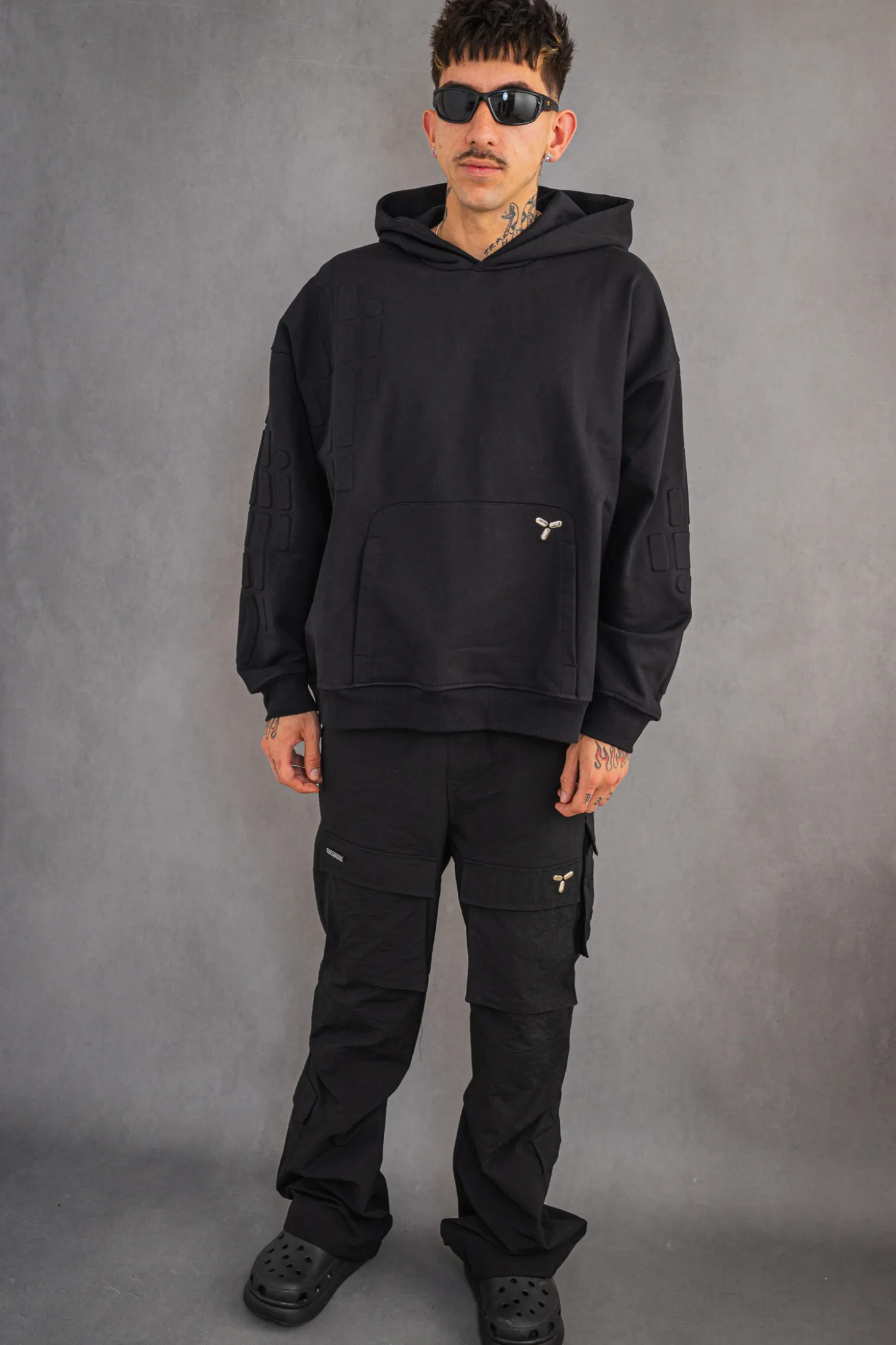 Bluza z kapturem Chaos Embossed Black to ponadczasowy dodatek do każdej garderoby, łączący subtelną estetykę z nowoczesnym designem. Charakteryzuje się ona wysokiej jakości czarnym materiałem, który jest jednocześnie wytrzymały i miękki w dotyku, co zapewnia komfort użytkowania. Na bluzie został wytłoczony unikatowy wzór, który dodaje elegancji i modernistycznego stylu. Dyskretny, ale wyrazisty detal w formie logotypu Chaos umieszczony jest na kieszeni typu kangurka, nadając bluzie charakterystycznego akcentu. Bluza jest zaprojektowana z myślą o wszechstronnym użytkowaniu, posiada praktyczny kaptur, który gwarantuje ochronę przed zimnem oraz dodaje stylu miejskiego looku. Ściągacze na mankietach i na dole bluzy zapewniają idealne dopasowanie i zatrzymują ciepło. Prosty, ale efektowny design sprawia, że bluza doskonale sprawdzi się zarówno jako element codziennego ubioru, jak i bardziej wyrafinowanej stylizacji. Idealnie pasuje do wielu rodzajów odzieży, od casualowych jeansów po sportowe spodnie dresowe.