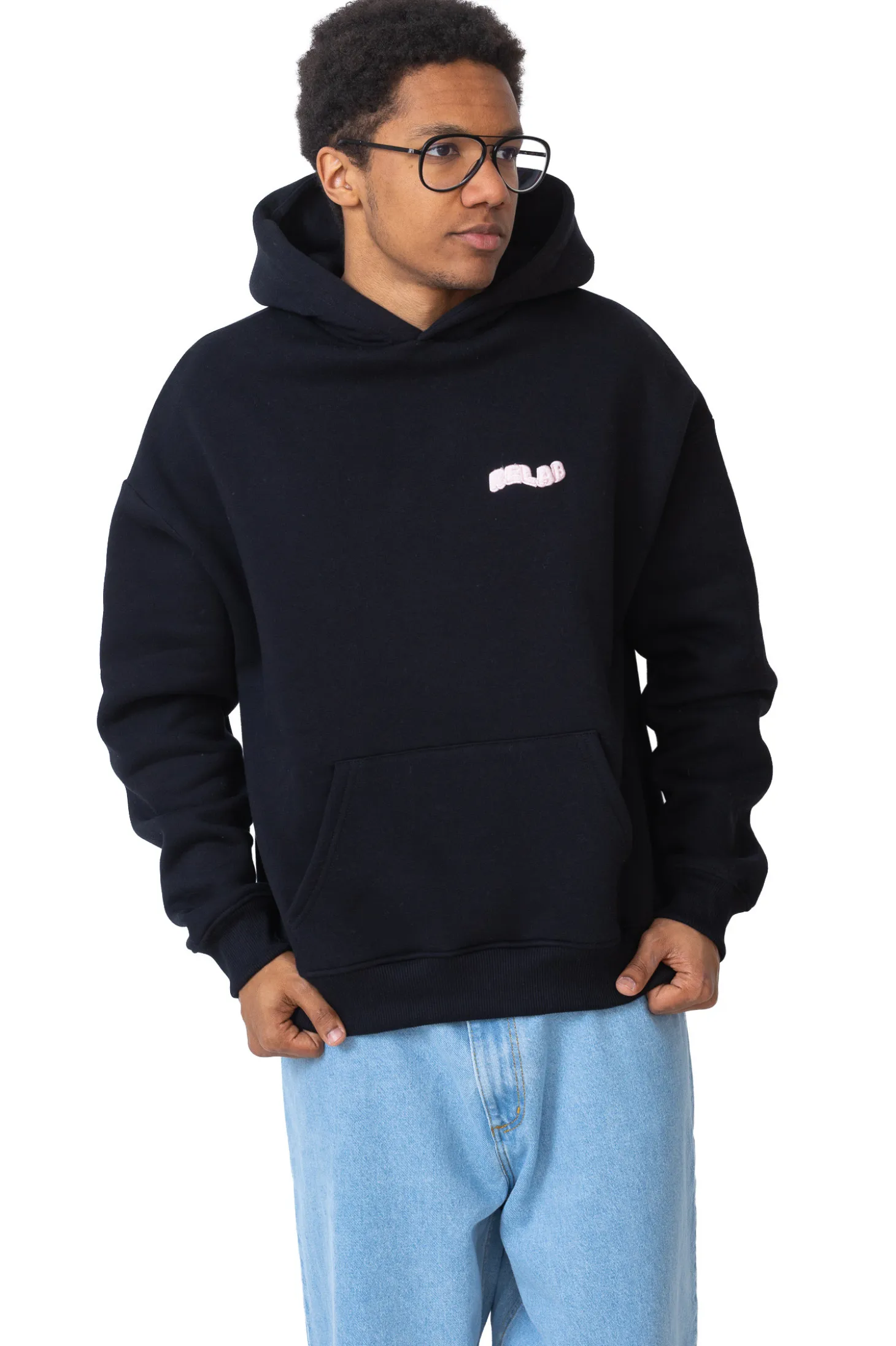 Bluza Relab z kapturem w kolorze czarnym z różowym haftem.