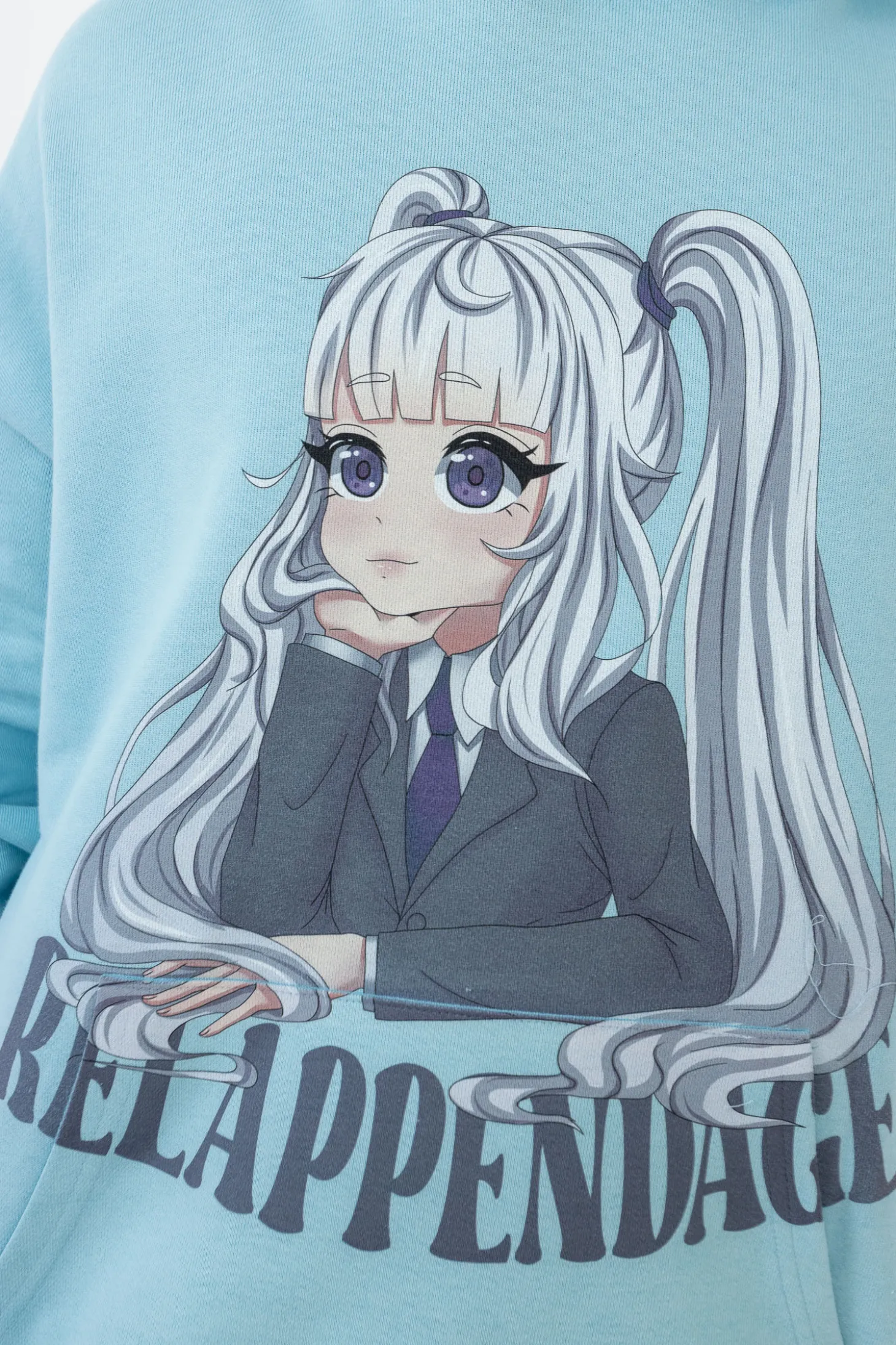 Bluza Relappendage z kapturem, w kolorze niebieskim z mangowym nadrukiem na przodzie. Bluza z długim rękawem w szerszym kroju, który nie krępuje ruchów.