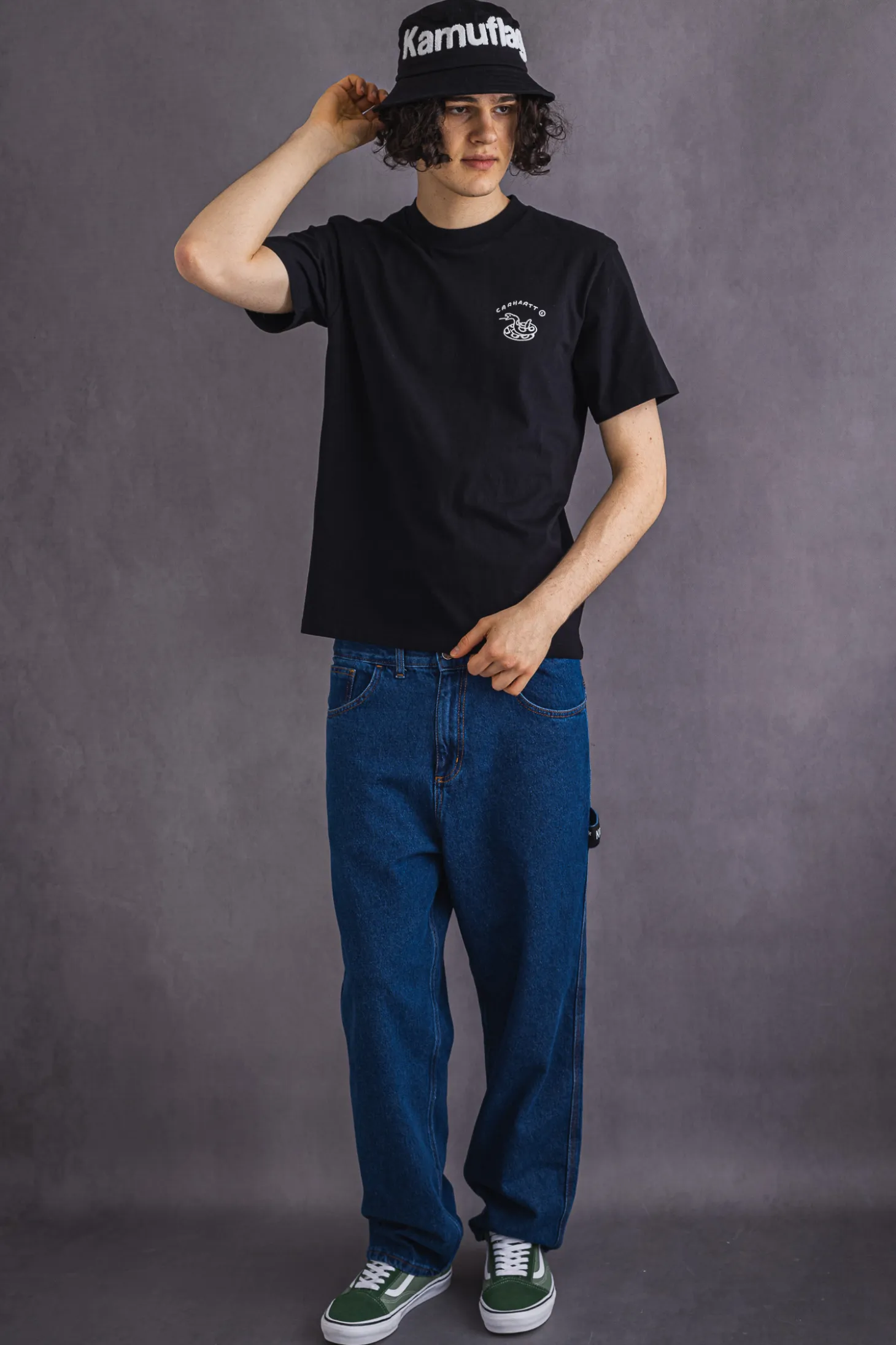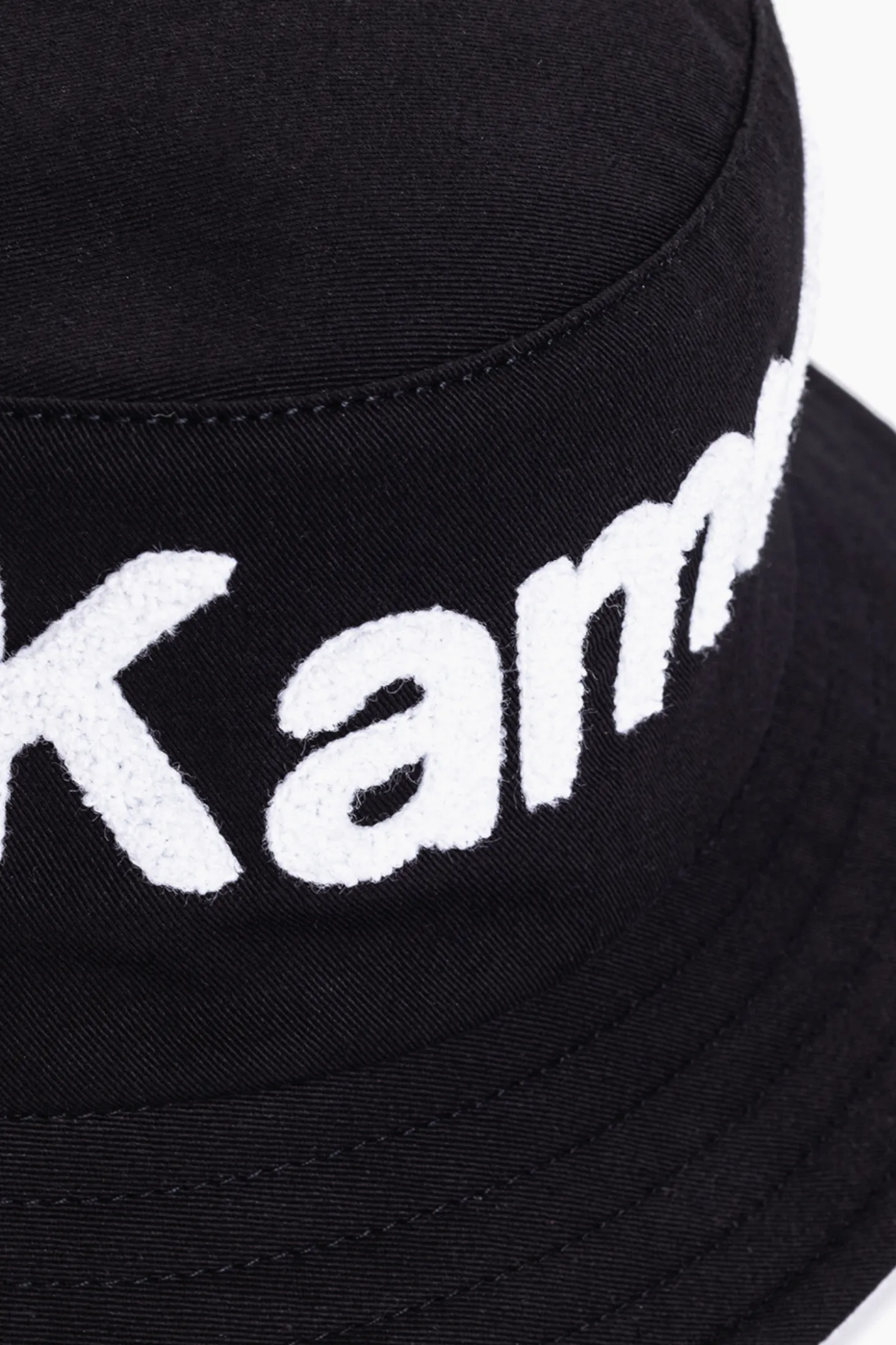 Kapelusz Kamuflage, w kolorze czarno-białym, z szenilowym logo na przodzie.