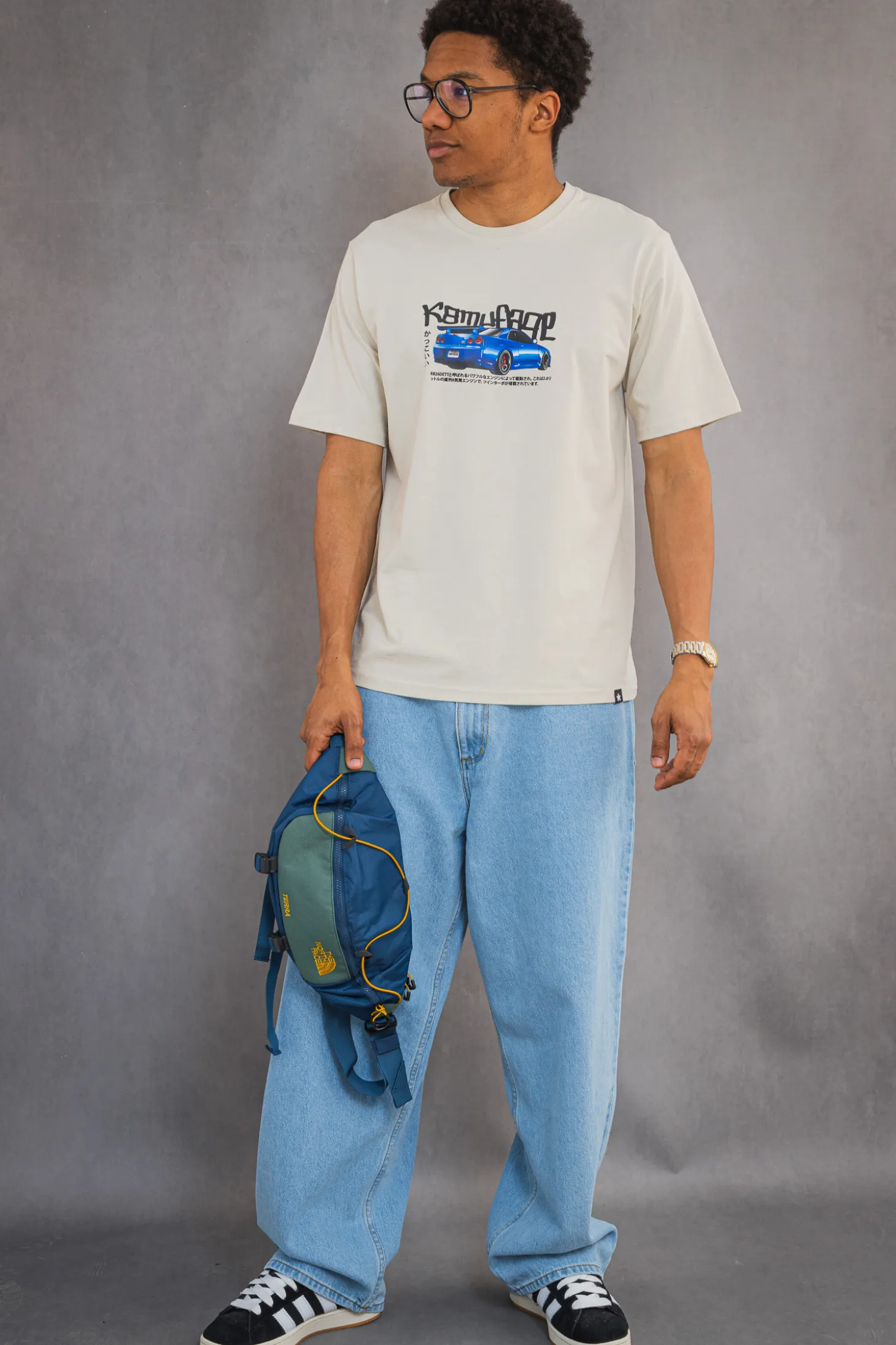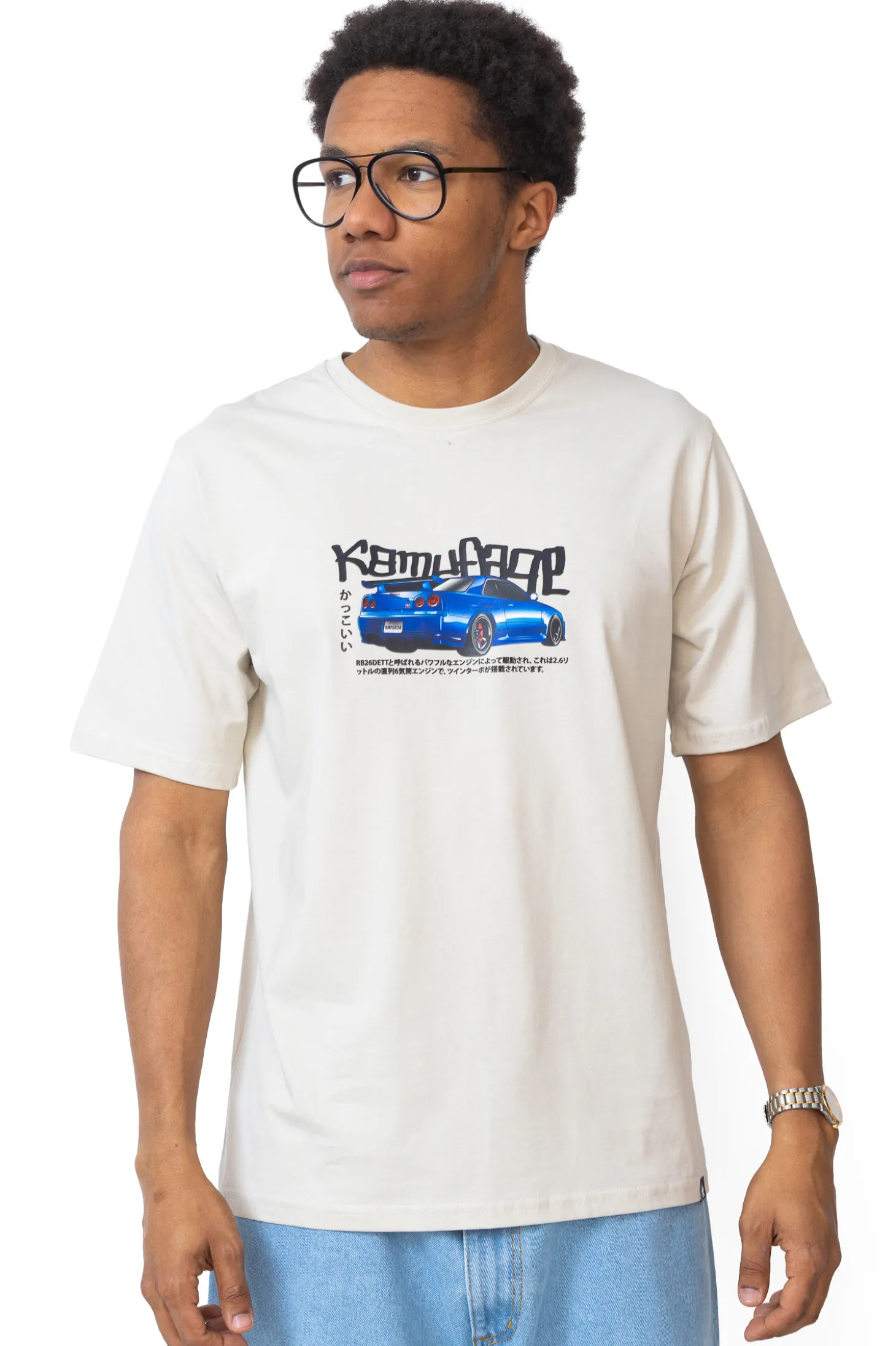 Koszulka 'Kamufllage R34 Beige’ to kwintesencja połączenia pasji motoryzacyjnej z miejskim stylem. Na beżowym tle tej męskiej koszulki króluje nadruk ikonicznego, niebieskiego samochodu sportowego, co nadaje koszulce dynamiczny i nowoczesny charakter. Nadrukowane logo 'Kamufllage’ w stylu graffiti oraz japońskie znaki poniżej pojazdu podkreślają inspiracje subkulturą tuningową. Wykonanie z wysokiej jakości bawełny zapewnia komfort noszenia, a beżowy kolor koszulki stanowi doskonałą bazę pod casualowe i streetwearowe stylizacje. To propozycja dla mężczyzn, którzy chcą wyrazić swoją osobowość i zamiłowanie do szybkich aut, nie rezygnując z komfortu i stylu.