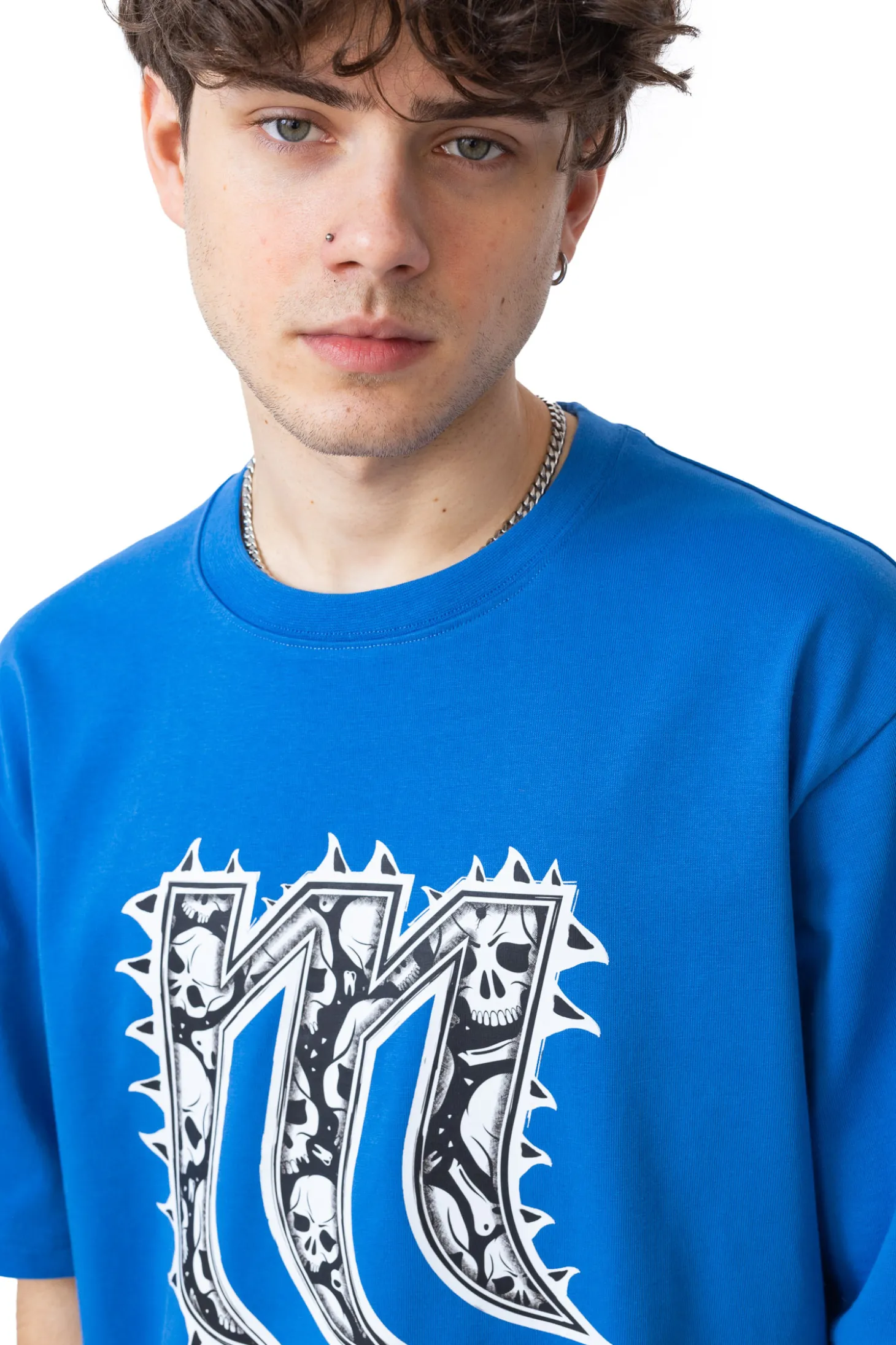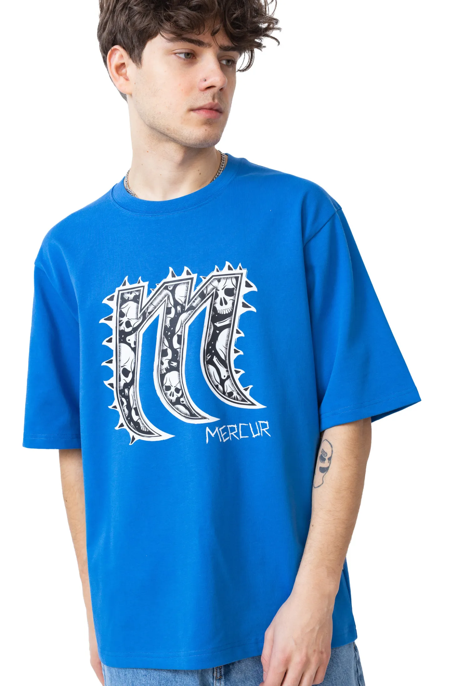 Koszulka Mercur Spike Blue to odważny, streetwearowy element garderoby, wyróżniający się grafiką litery „M”, otoczonej kolcami i wypełnionej motywem czaszek. Intensywny, niebieski kolor nadaje jej energii i sprawia, że świetnie komponuje się zarówno z jasnymi, jak i ciemnymi stylizacjami.