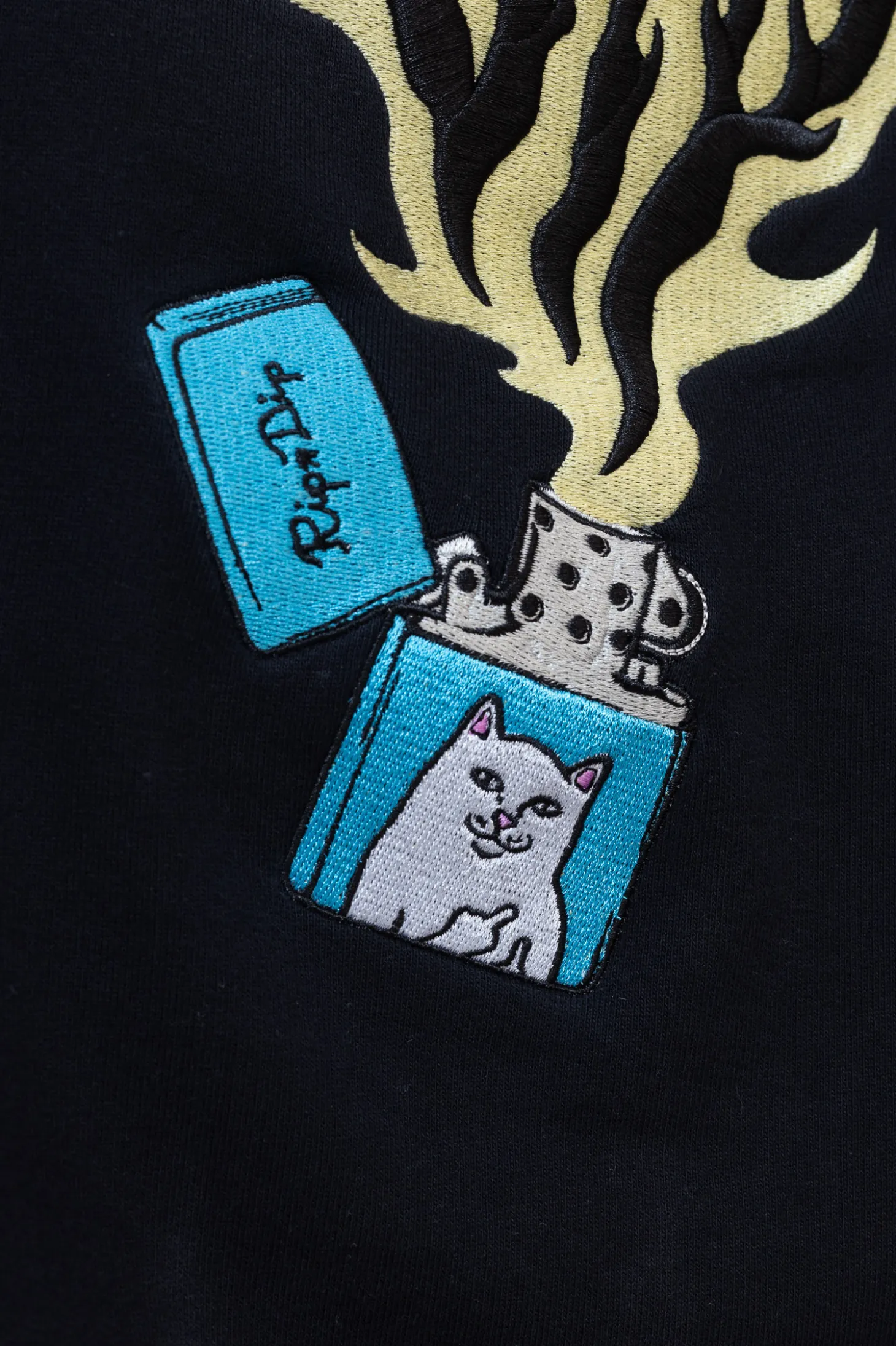 Bluza z kapturem Ripndip Ripnlit Black RNDSPR25117 to wyrazisty element streetwearowej garderoby, który łączy mroczny klimat z charakterystycznym humorem marki. Na plecach znajduje się efektowna grafika przedstawiająca płomienie układające się w logo Ripndip, wydobywające się z zapalniczki ozdobionej kultowym kotem Lordem Nermalem. Wykonana z wysokiej jakości materiału, zapewnia komfort noszenia i doskonale komponuje się z luźnymi, miejskimi stylizacjami.