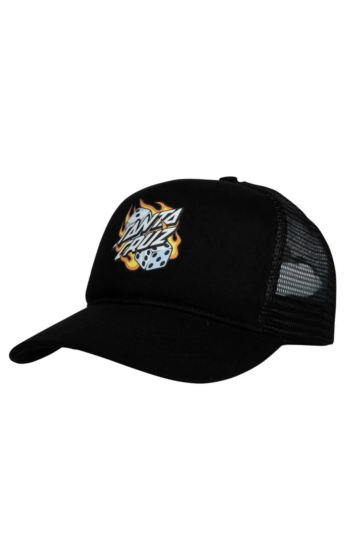 Czapka z daszkiem Santa Cruz Flaming Dice Dot Black z siateczkowym tyłem i grafiką płonących kości oraz dynamicznie stylizowanym logo Santa Cruz przyciąga spojrzenia i dodaje pazura każdej miejskiej stylizacji. Dzięki regulowanemu zapięciu i przewiewnemu panelowi, czapka zapewnia komfort przez cały dzień – niezależnie czy jesteś na deskorolce, czy w centrum miasta.