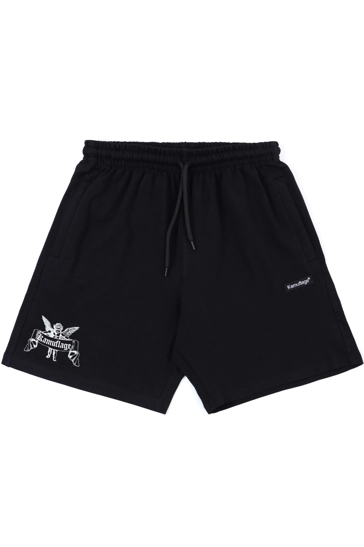 Szorty Kamuflage Hellfire Black to mocna propozycja dla fanów streetwearu z charakterem. Czarne, klasyczne tło kontrastuje z wyrazistym nadrukiem anioła trzymającego logo Kamuflage, dodając stylizacji unikalnego pazura. Wygodny krój, elastyczny pas i bawełniany materiał sprawiają, że to idealny wybór na miejskie lato i chill na pełnym luzie.